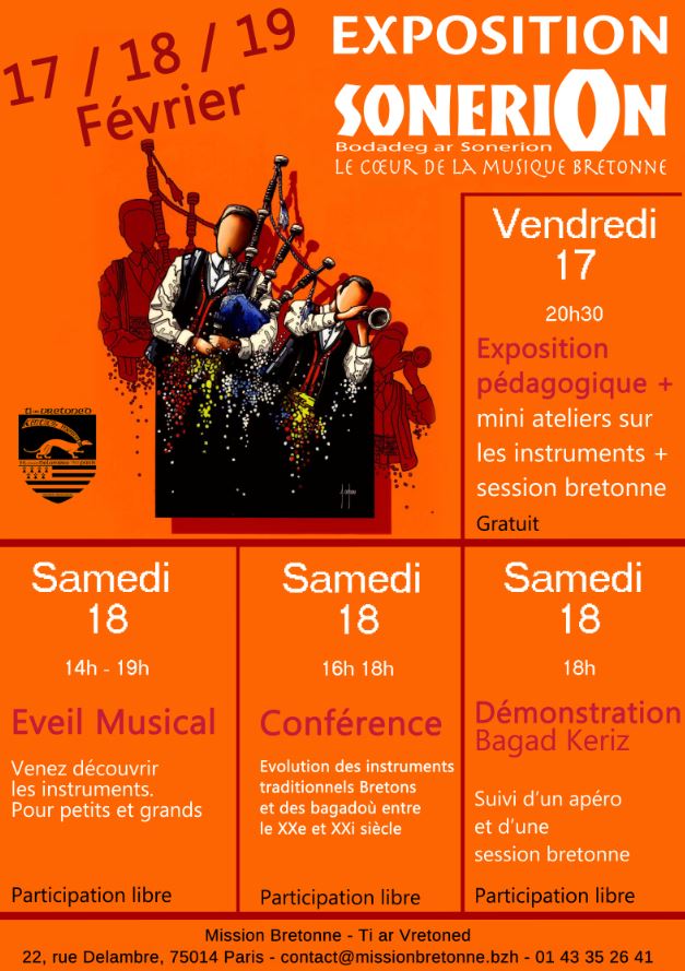 Vendredi 17 février, 20h30, gratuit : Exposition pédagogique, présentation des instruments bretons avec des mini ateliers pour pratiquer et découvrir les instruments. Suivi d’une session bretonne musicale.