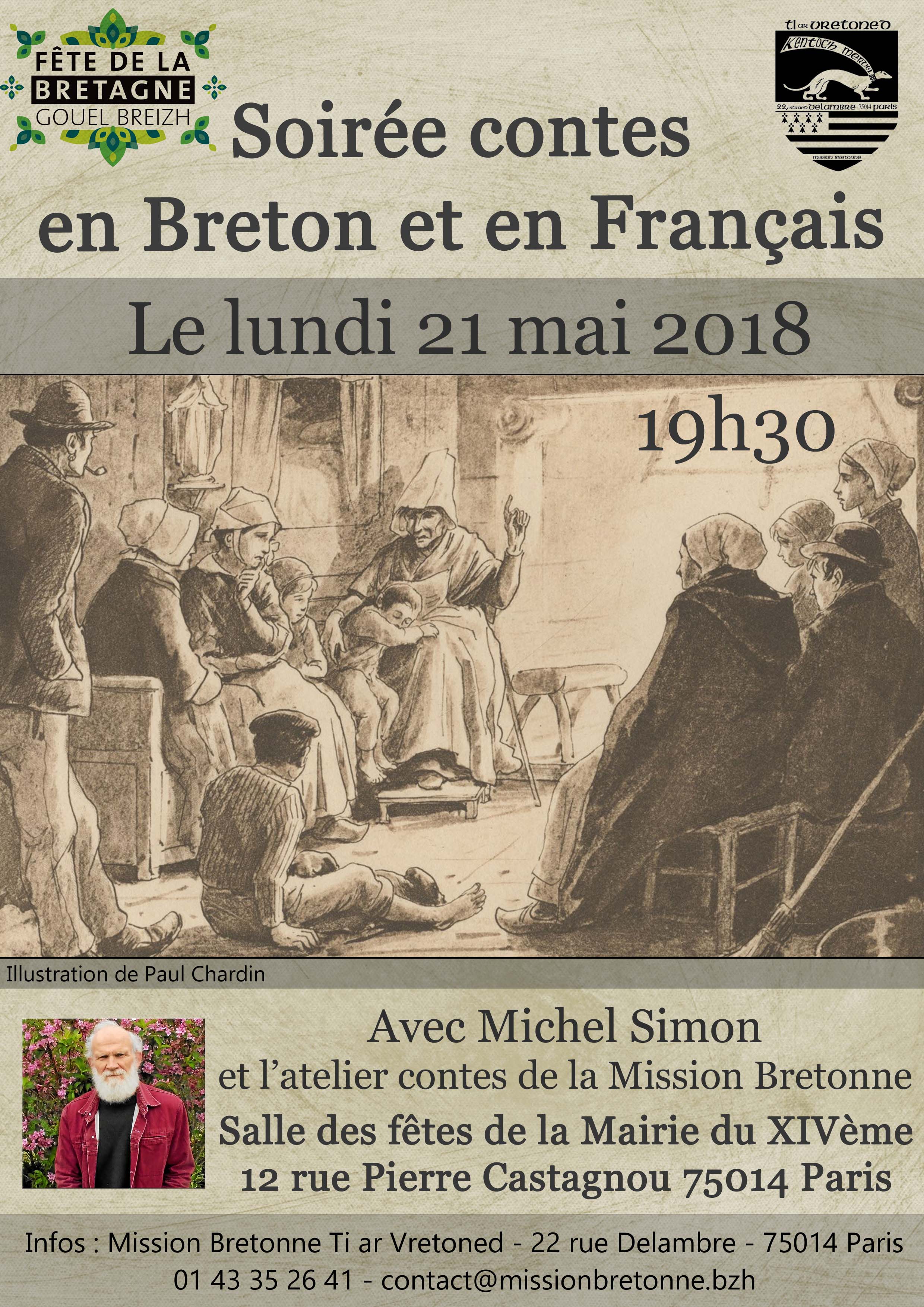 Michel Simon et les ateliers contes de la Mission Bretonne vous invitent à une soirée contes en Breton et en Français, pour les amoureux des belles histoires.