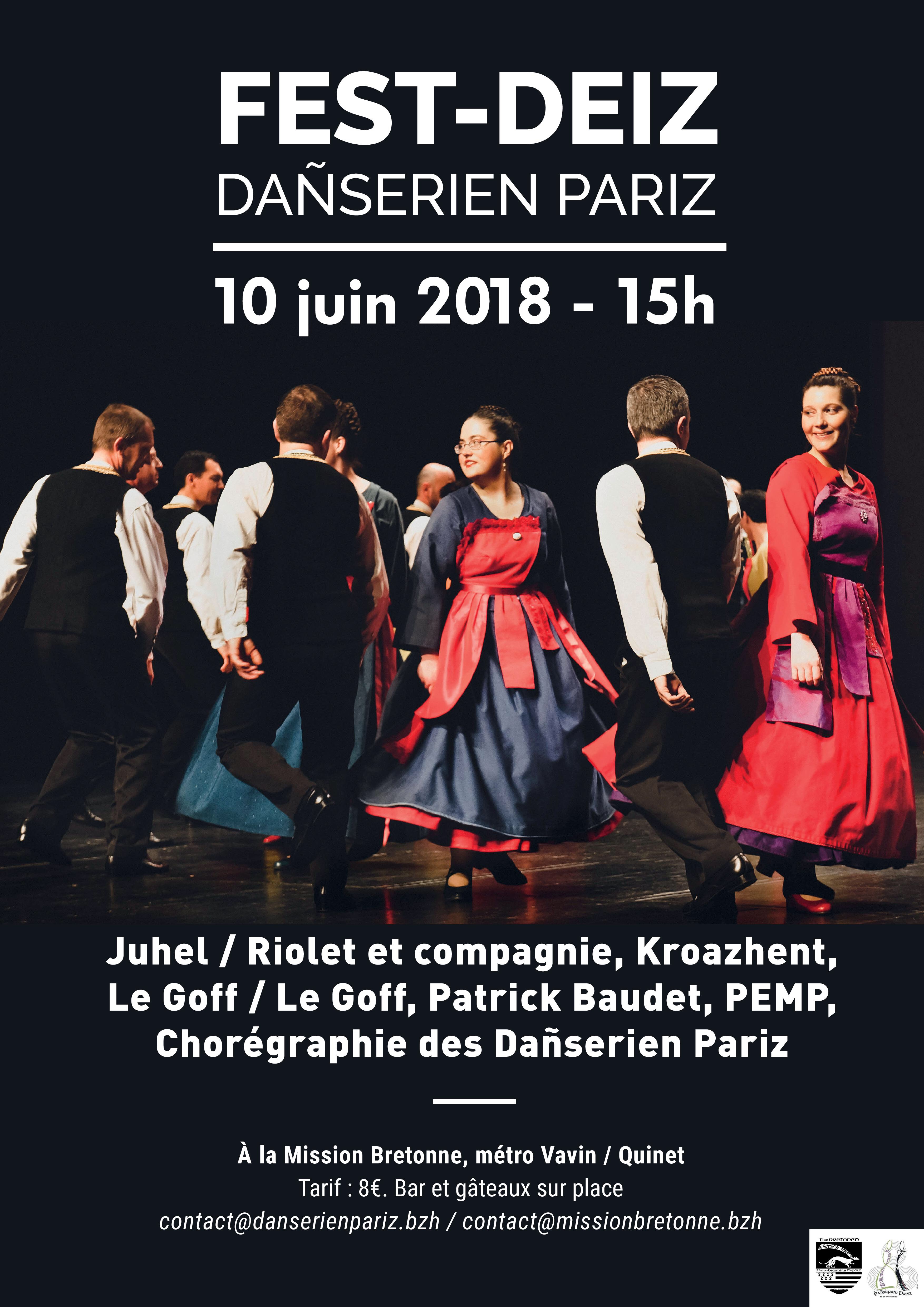 Fest-deiz de soutien à Dañserien Pariz dimanche 10 juin 2018 Mission Bretonne Evénements 0 Animé par le duo Juhel/Riollet et Cie, Kroazhent, les chanteuses Le Goff/Le Goff, Patrick Baudet, Pemp et la dernière chorégraphie de Dañserien Pariz. Bar et gâteaux sur place Entrée : 8 €