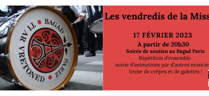 Les vendredis de la Mission du 17 février vendredi 17 février 2023 Mission Bretonne Evénements 0 Soirée de soutien au Bagad Pariz 17 février 2023 20h30 répétition d’ensemble suivie d’animations par d’autres musiciens. Et vente de crêpes et de galettes !