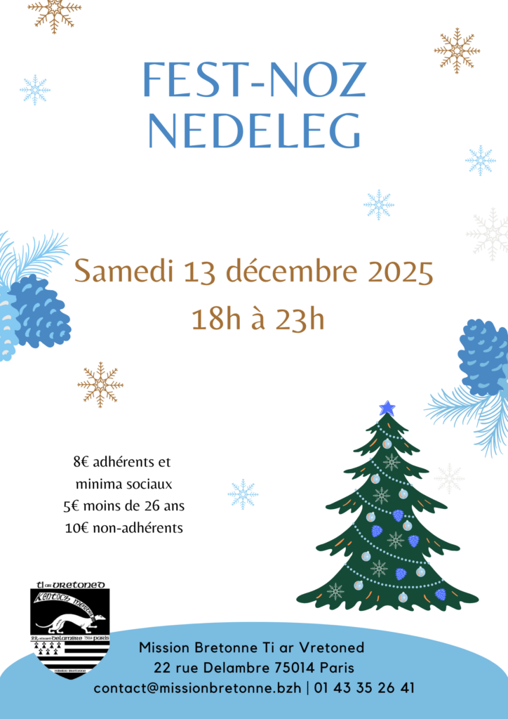 Fest-noz Nedeleg samedi 13 décembre 2025 Enora Actus, Evénements, Newsletter 0 18h à 23h. Plus d’informations à suivre … Tarifs : 5€ -26 ans, 10€ non-adhérents, 8€ adhérents et minima sociauxPriz : 5€ -26 bloaz, 10€ ar re all, 8€ an izili hag korvoderioù sokial