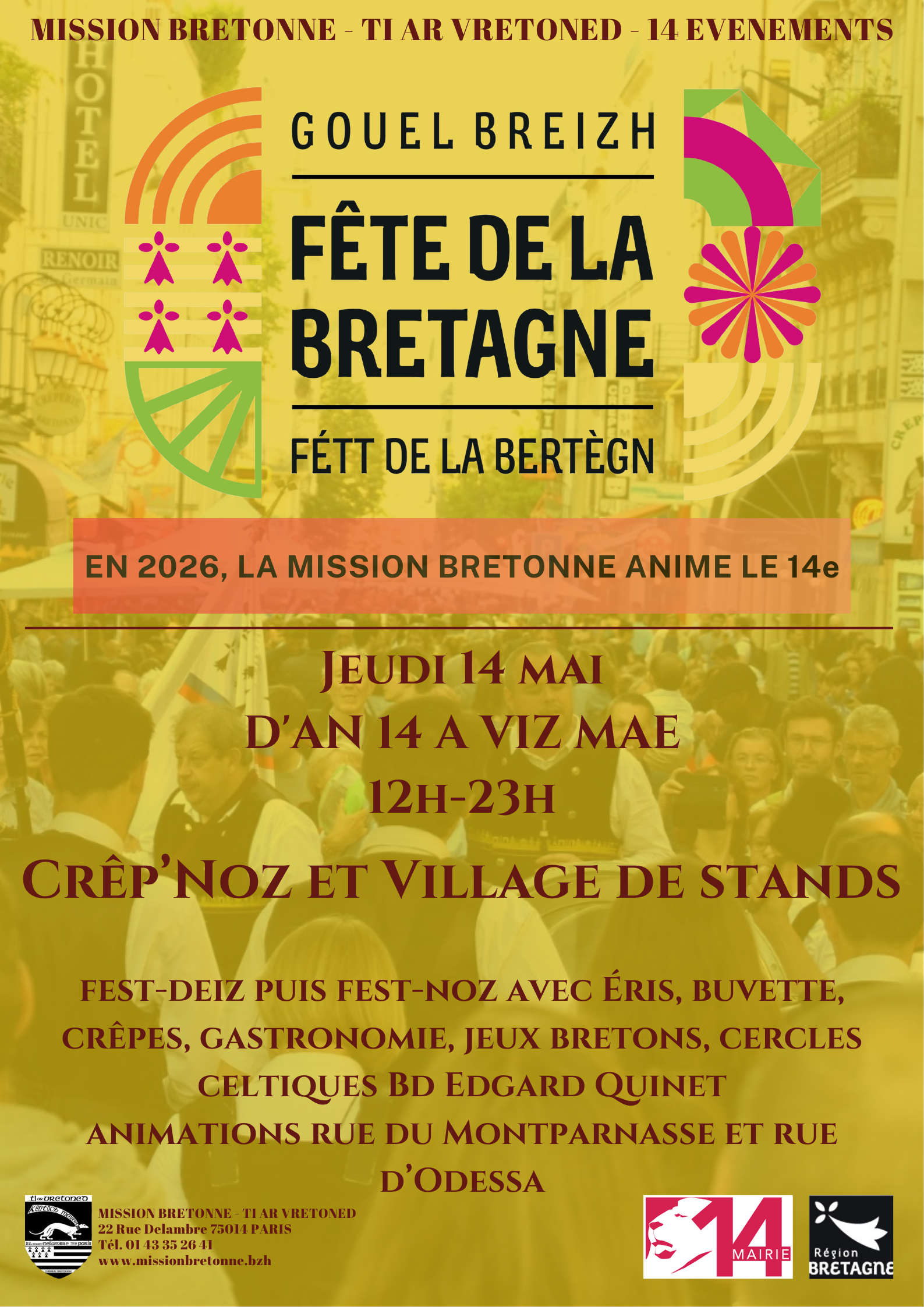 Jeudi 14 mai de 12h à 23h, boulevard Edgar Quinet : fest-deiz puis fest-noz avec Éris, buvette, crêpes, gastronomie, jeux bretons, cercles celtiques et animations rue du Montparnasse et rue d’Odessa.