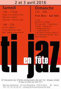 Pour cette occasion, les Ti Jaz mettent le paquet. Concert, bal folk, fest-deiz, stage de diato avec Bernard Lasbleiz, ambiance musette, et la présence exceptionnelle du groupe Flor de Zinc (musique d’Auvergne) et de Jacques Lanfranchi. Bref, que du bon !
