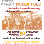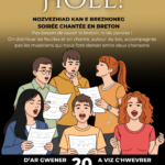 | vendredi 30 | 20:30 à 23:00 | C’hoant ho peus kanañ met n’anavezit ket ar pozhioù ? / Envie de chanter en breton même sans savoir le parler ? Roet e vo deoc’h ar pozhioù war al lec’h. / On vous donnera les paroles sur place. Donemat eo ar sonerien. / Les musiciens sont les bienvenus. Deuit da gemer perzh ganeomp en ur evañ ur banne. / Venez vous joindre à nous autour […] |