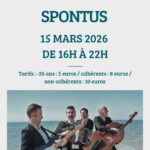 | dimanche 15 | Dimanche 15 mars de 16h à 21h Spontus défend une musique à danser renouvelée, une créativité débridée qui tisse le lien entre les danseurs et les musiciens. Une musique qui s’envole souvent vers des sonorités nouvelles, mais qui atterrit toujours dans un fest-noz (bal) quand le violon et la guitare kan et diskan, ou que l’accordéon et la basse jouent à la bombarde et au […] |