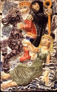 Le roi Gradlon régnait sur la pays de Cornouaille, il avait épousé une déesse du Nord, Malgven, qui mourut en pleine mer en mettant au monde une fille appelée Dahut. La petite fille et son père vivaient à Quimper, capitale de Cornouaille. Avec le temps, Dahut devint une très belle jeune femme, à la beauté envoutante et sauvage, à l’image de l’océan auquel elle savait appartenir, puisqu’elle était née en mer. Exaspérée par l’influence de l’évêque Corentin et du moine Guénolé sur son père et sur la Cornouaille, Dahut demanda un jour à Gradlon de lui construire une cité sur la mer, pour elle seule. Le projet était grandiose, et allait épuiser les finances du royaume, mais, par amour pour sa fille, le père s’exécuta et fit construire une ville magnifique, qui devint vite très riche et luxueuse. Elle devint aussi la ville de la luxure et de toutes les débauches, à l’image de la vie sulfureuse de la jeune fille qui multipliait les amants et n’hésitait pas à commettre des meurtres. Corentin, voyant d’un mauvais œil cette cité pleine de débauche, envoya Guénolé pour rétablir l’ordre, sans succès. Saint-Guénolé, abbé de Landévennec, est donc l’homme de Dieu qui tente de remettre Ys dans le droit chemin et particulièrement la princesse Dahut. Le diable en personne finit par s’y inviter et mena la ville et sa princesse à leur perte, toutes deux englouties par la mer, rendant ainsi Dahut à l’Océan. »
