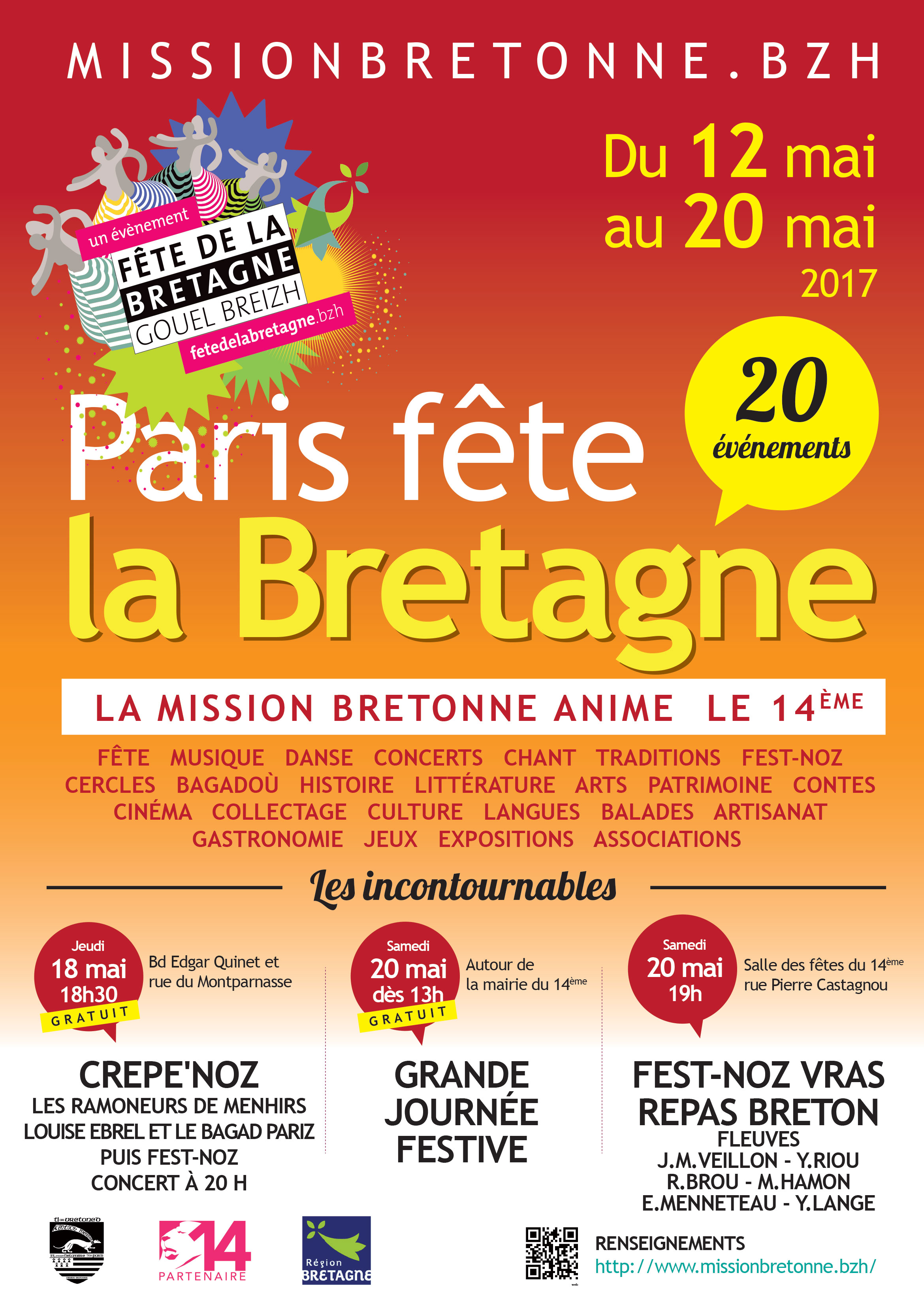 Du vendredi 12 mai au samedi 20 mai 2017 : 9 jours pour célébrer la culture bretonne sous toutes ses formes. Fest-deiz, fest-noz, conférences, balades historiques, concours de sonneurs, contes, expositions, jeux bretons, cinéma, balade chantée, crep’noz, grand pardon de Saint-Yves, concert bombarde et orgue, flashmob, stands artisanaux, culturels et gastronomiques…