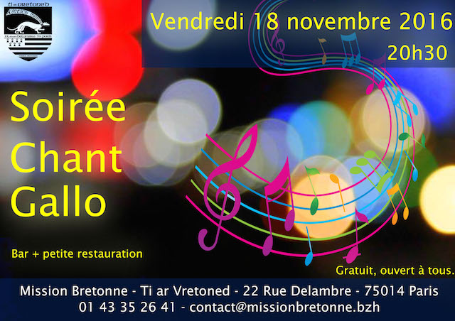 Soirée chant gallo vendredi 18 novembre 2016 Mission Bretonne Evénements 0 Dans le cadre des Vendredis soirs de la Mission, l’atelier Chant gallo débarque en force : chants à danser, complainte, chant à répondre… Bar et tapas par Christophe et son équipe.
