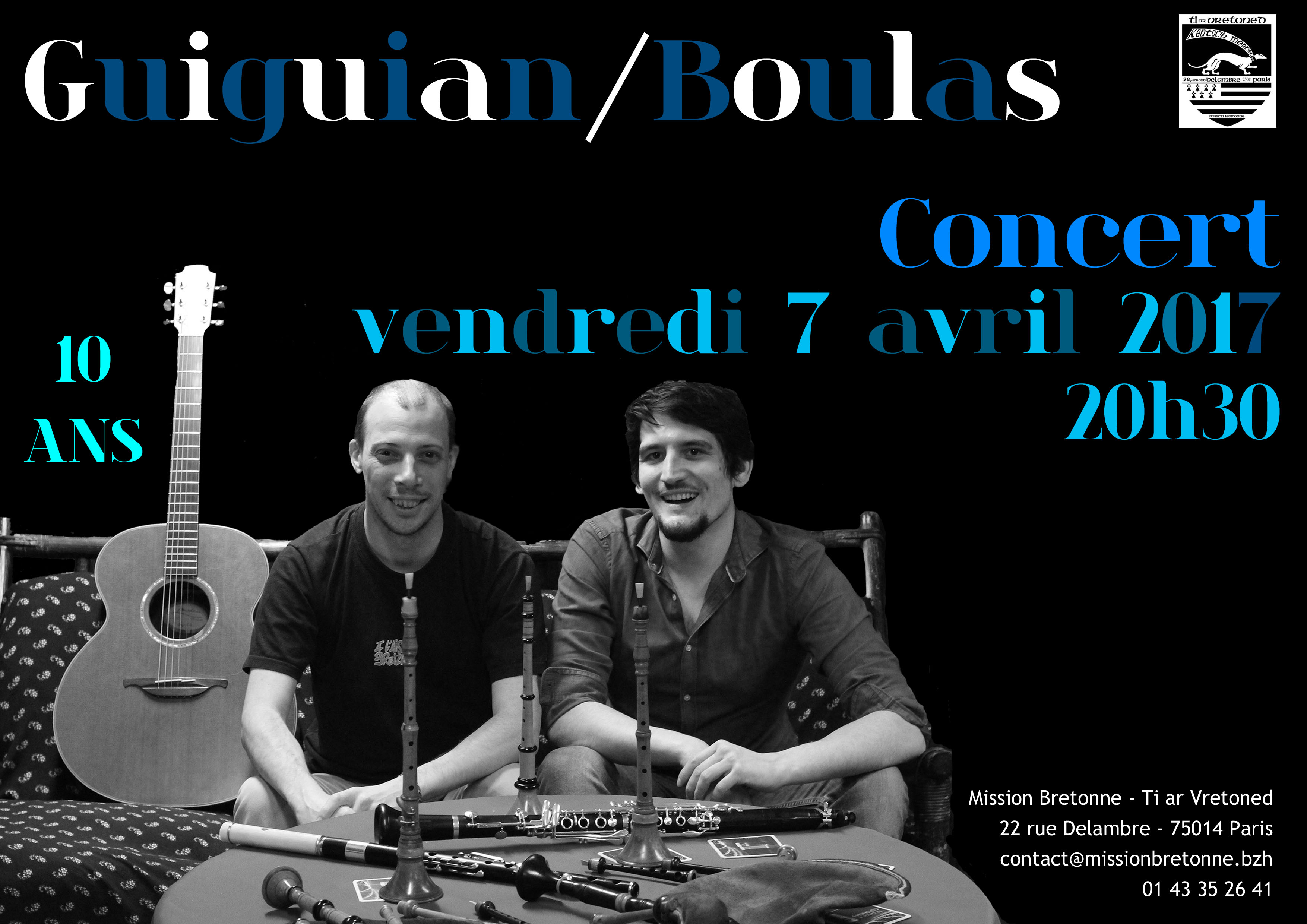 Concert gratuit de Guiguian/Boulas vendredi 7 avril 2017 Mission Bretonne Evénements 0 Vendredi 7 avril: 20h30 Concert pour les 10 ans du duo Guiguian/Boulas Concert de Guiguian/Boulas Clarinette, guitare, biniou, bombarde et chant gallo seront à l’honneur. Participation libre