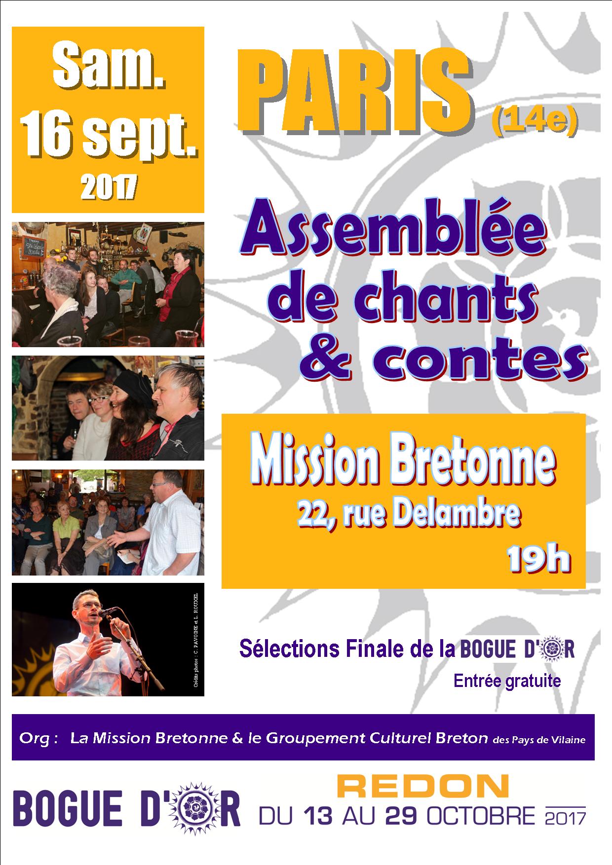 En collaboration avec le Groupement Culturel Breton des Pays de Vilaine, et dans le cadre de la Bogue d’Or qui se déroulera du 15 au 25 octobre 2017 à Redon, la Mission Bretonne organise le 16 septembre, à partir de 19 heures, une assemblée de chants et de contes du pays gallo.