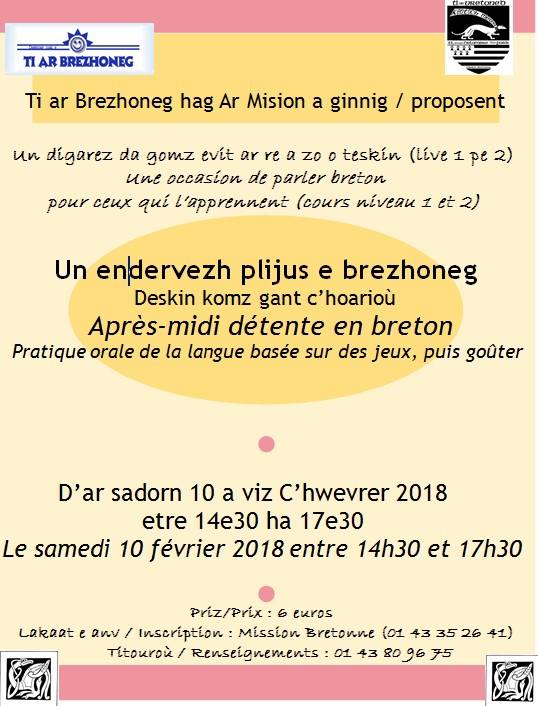 Au programme, jeux interactifs (deux à deux, en groupe, etc..) pour assimiler de façon ludique les bases de la conversation en breton (faire connaissance, partager un repas). Puis, nous finirons l’après-midi par un gouter où nous pourrons mettre en pratique ce que nous avons vu auparavant. Tout cela en breton.
