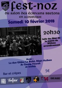 Fest-noz du salon Lire la Bretagne samedi 10 février 2018 Mission Bretonne Evénements 0 Dans le cadre du salon Lire la Bretagne des écrivains bretons à Paris A 20h30, salle des fêtes de la Mairie du 14ème Avec : Régis Huiban et Gildas Le Buhé, Ar Gazeg Veurzh, invités Crêpes, galettes, bar