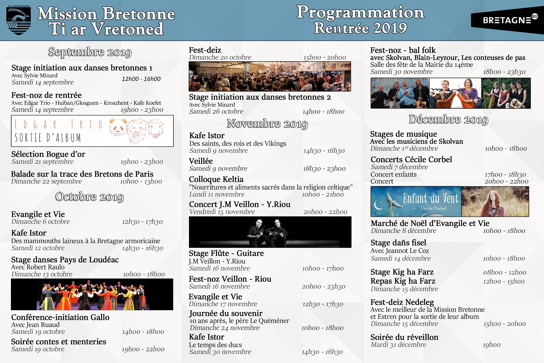 Pour commencer, on a toujours nos ateliers où on peut apprendre la culture bretonne dans une ambiance chaleureuse : danse, musique, langue bretonne, chant, contes …. Pour tout savoir, c’est ici : les ateliers et là : dépliant 2019-2020. Venez faire un cours d’essai si vous le souhaitez.