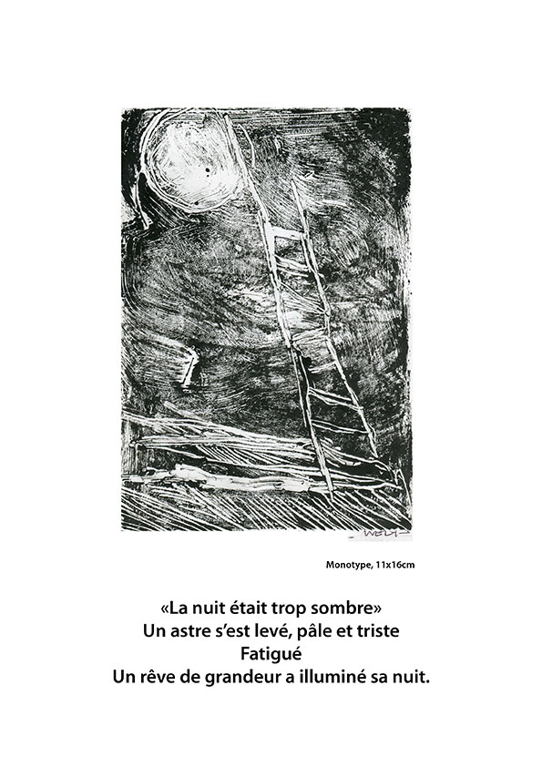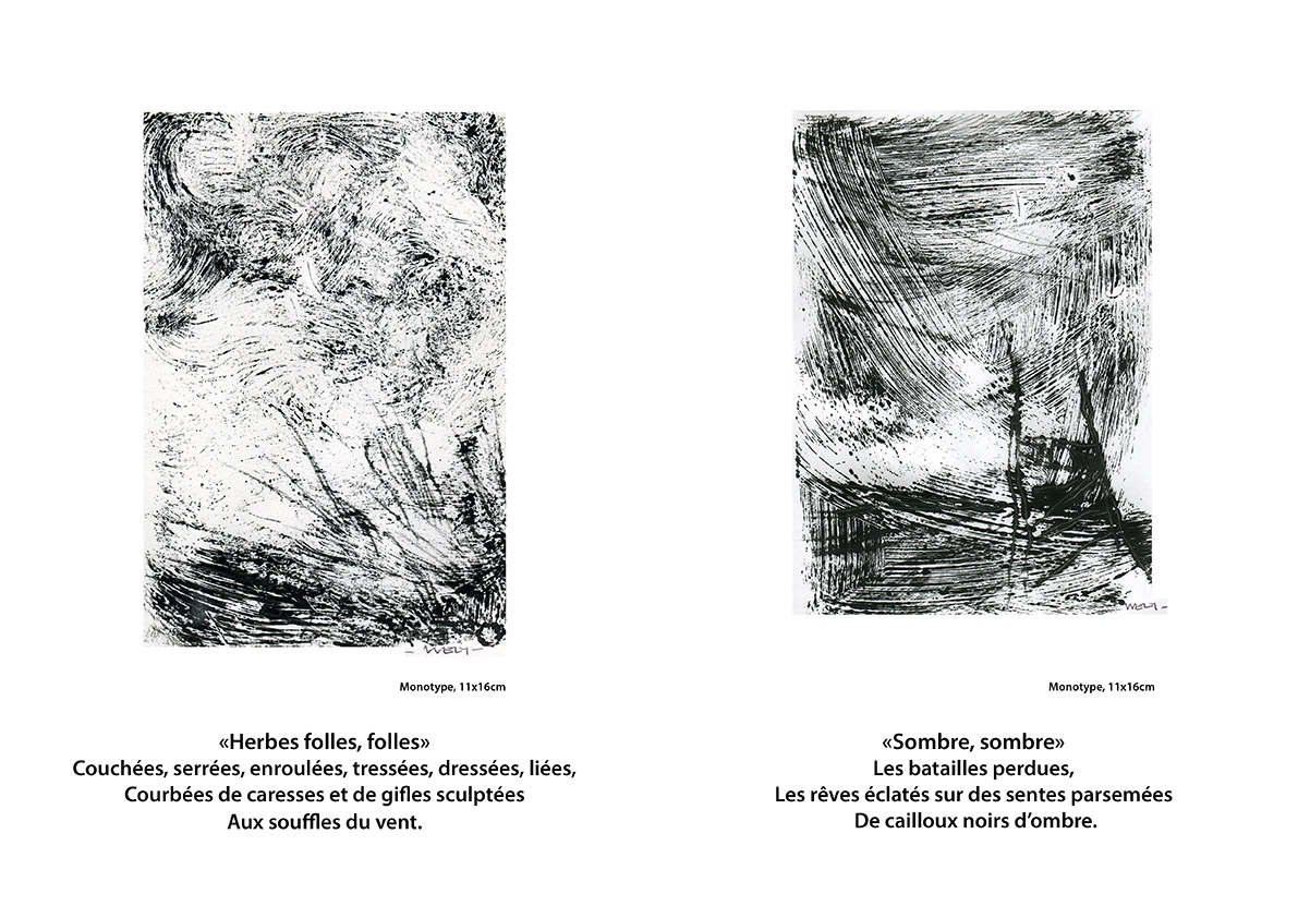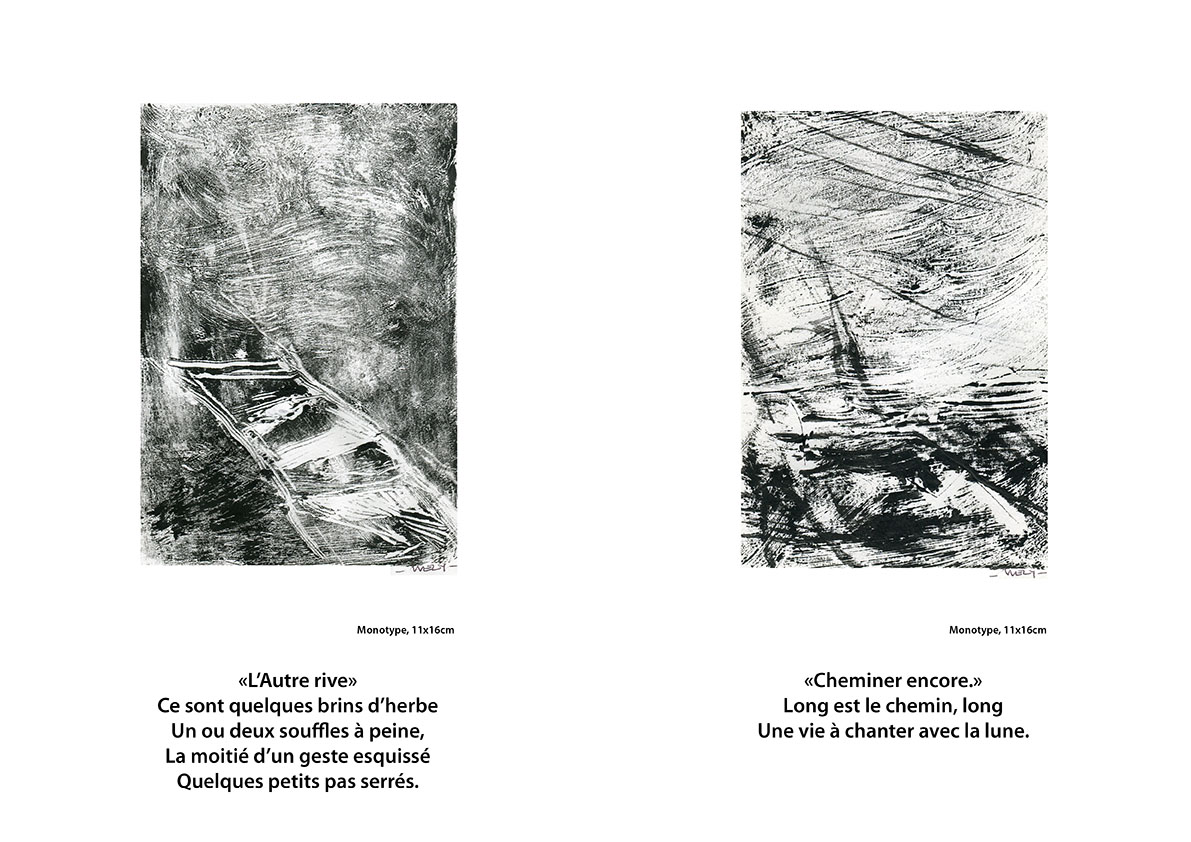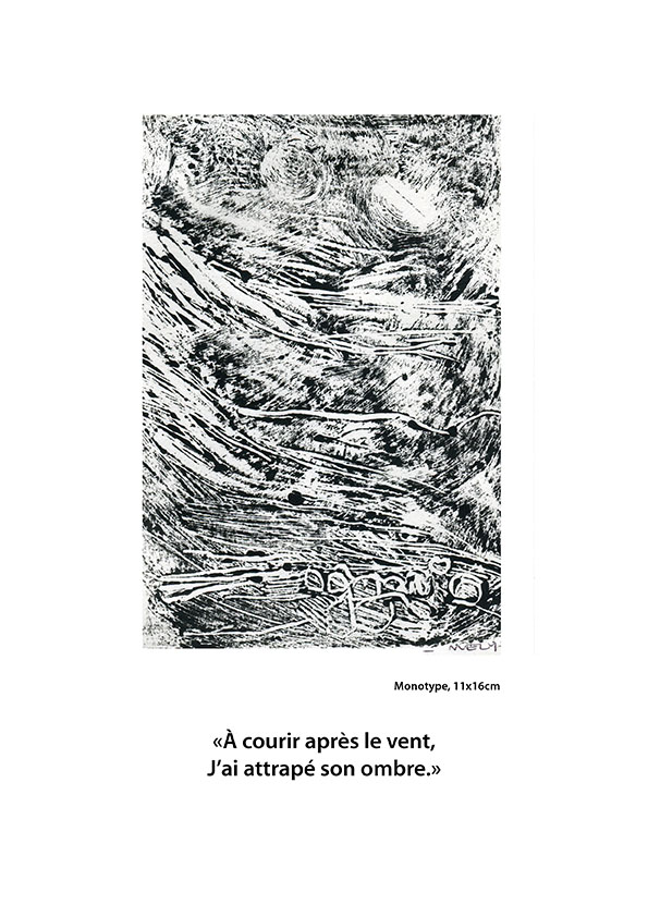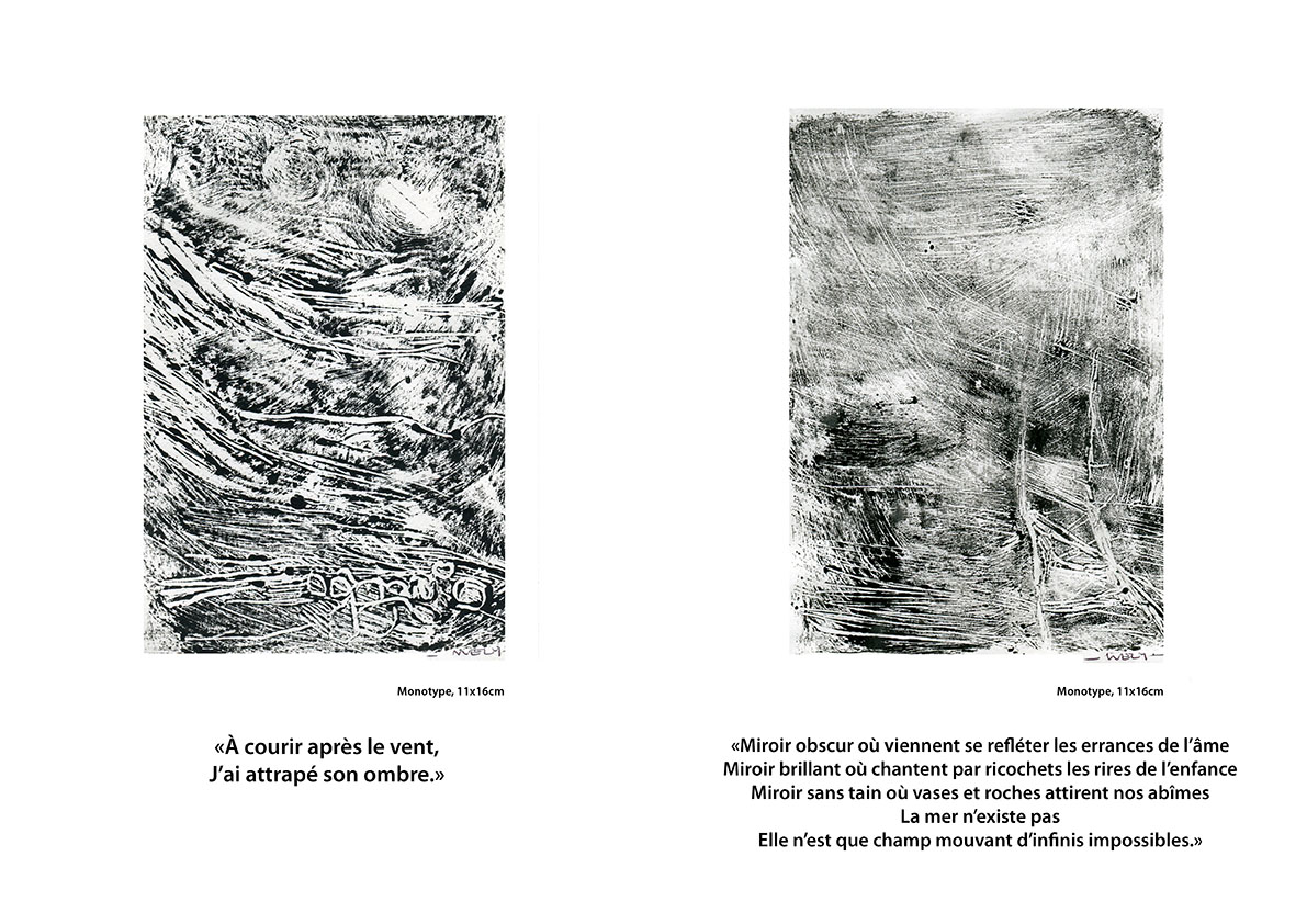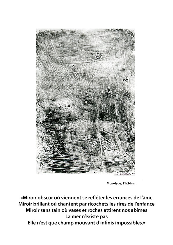 - La mer n’existe pas, une série de monotypes déjà présentée à la Mission. Une déambulation au bord de l’eau, une mer qui n’existe pas en soi, qui n’est que le reflet de ce que nous y projetons.