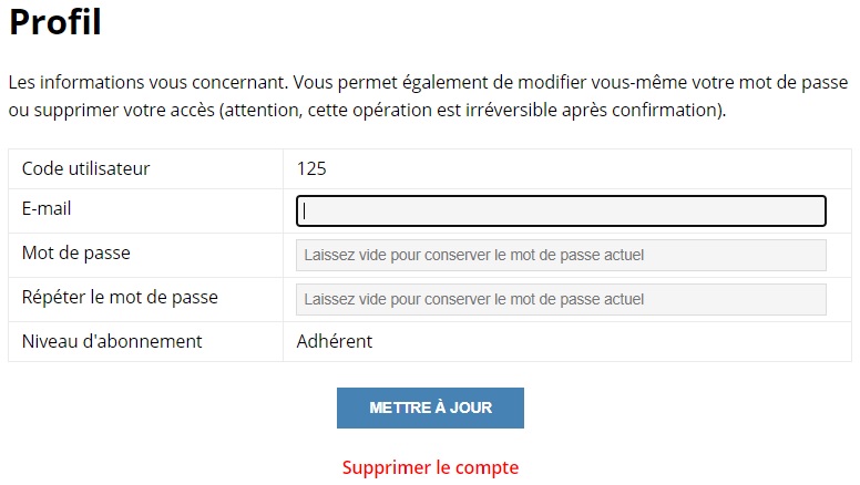 En cliquant sur Profil en bas et à droite, vous pourrez modifier vous-même votre mot de passe ou demander la suppression de votre accès. Cette suppression est protégée des usages malveillants, mais attention, elle est irréversible.