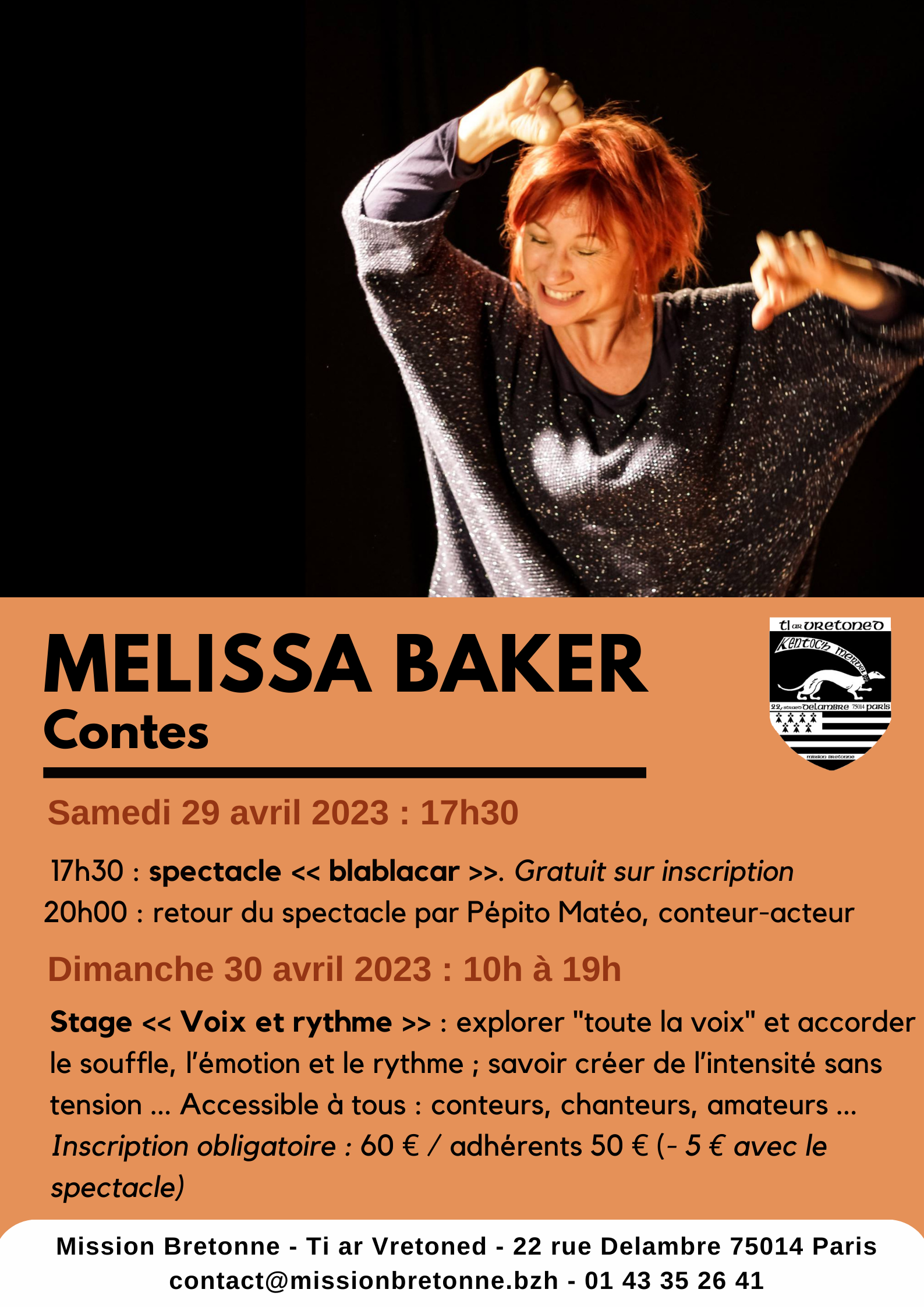 Étudiante à l’Actors Studio à New York dans les années 90, Melissa Baker obtient parallèlement un Bachelor (4 ans) à l’Université de New York en 1991 puis un Master « Arts de la scène » (2 ans) à l’Université de Californie en 2003. Depuis ses débuts dans le théâtre aux USA, puis plus tard en Irlande, elle chante dans le style rockabilly, folk/country et jazz. Grâce à une formation complète de comédienne et de chanteuse (production vocale, diction, respiration, chant et rythmique), elle adapte les techniques de chant à son travail de conteuse. Melissa Baker a été l’élève de Stella Adler (méthode Stanislavsky : technique de jeu naturaliste), d’Anne Bogart (méthode viewpoints : technique d’improvisation adaptée au jeu d’acteur) et de Michel Hindenoch (conte).