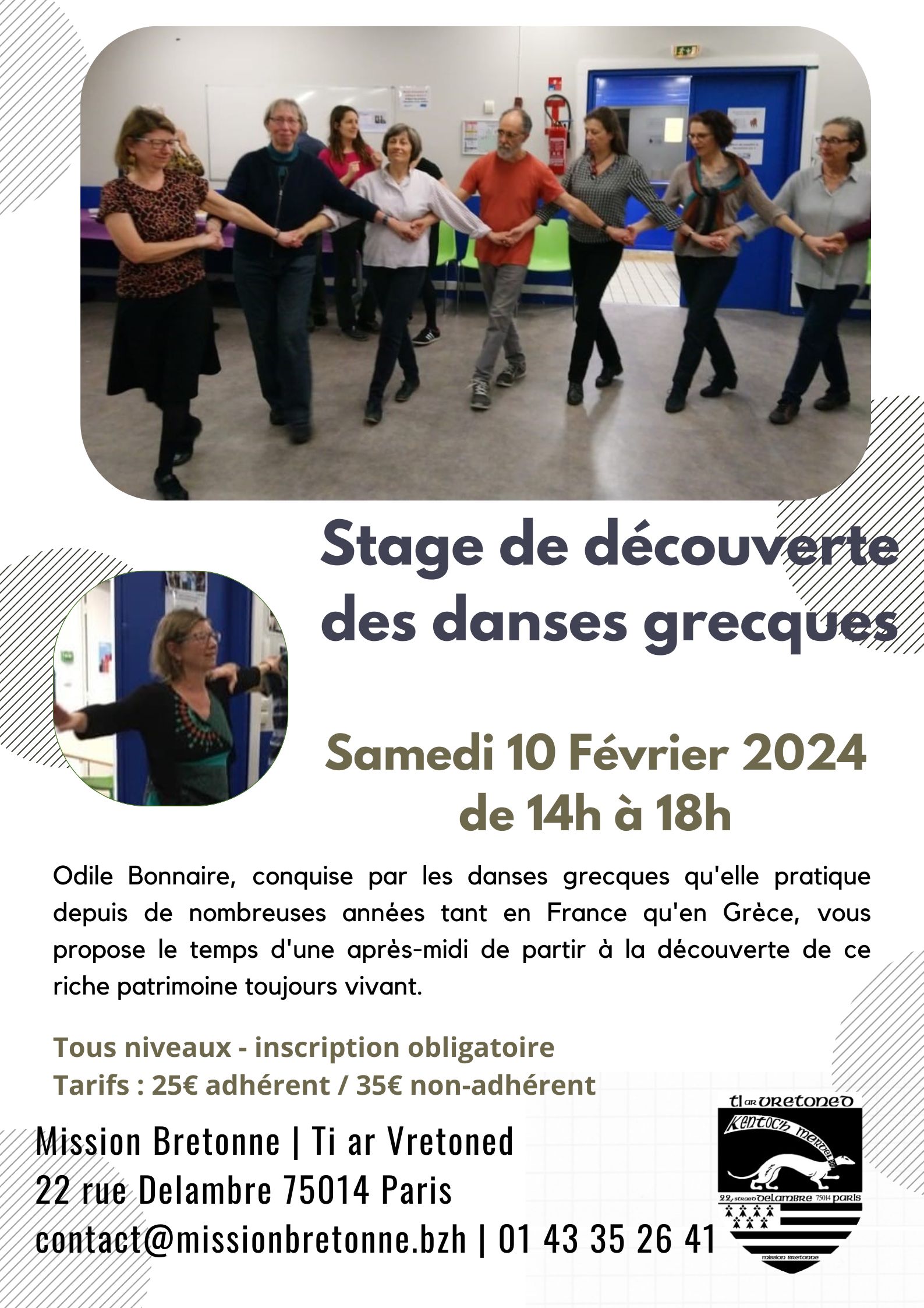 Le samedi 10 février de 14h à 18h, pour la 1ère fois à la Mission Bretonne à Paris, venez participer à une initiation par Odile Bonnaire aux danses grecques.