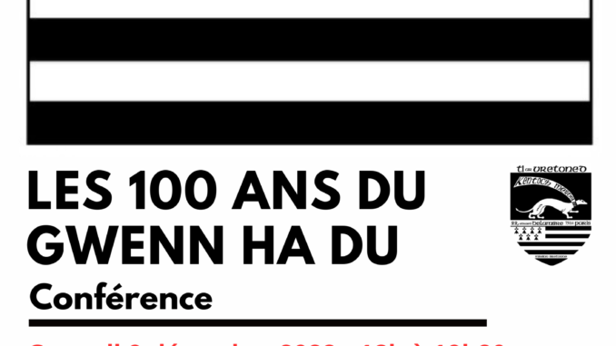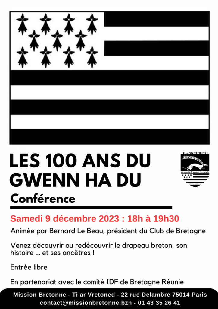 Conférence : les 100 ans du Gwenn ha Du samedi 9 décembre 2023 Enora Actus, Evénements, Newsletter 0 Venez découvrir ou redécouvrir le drapeau breton, son histoire … et ses ancêtres ! Conférence animée par Bernard Le Beau, président du Club de Bretagne. Entrée libre. En partenariat avec le comité IDF de Bretagne Réunie