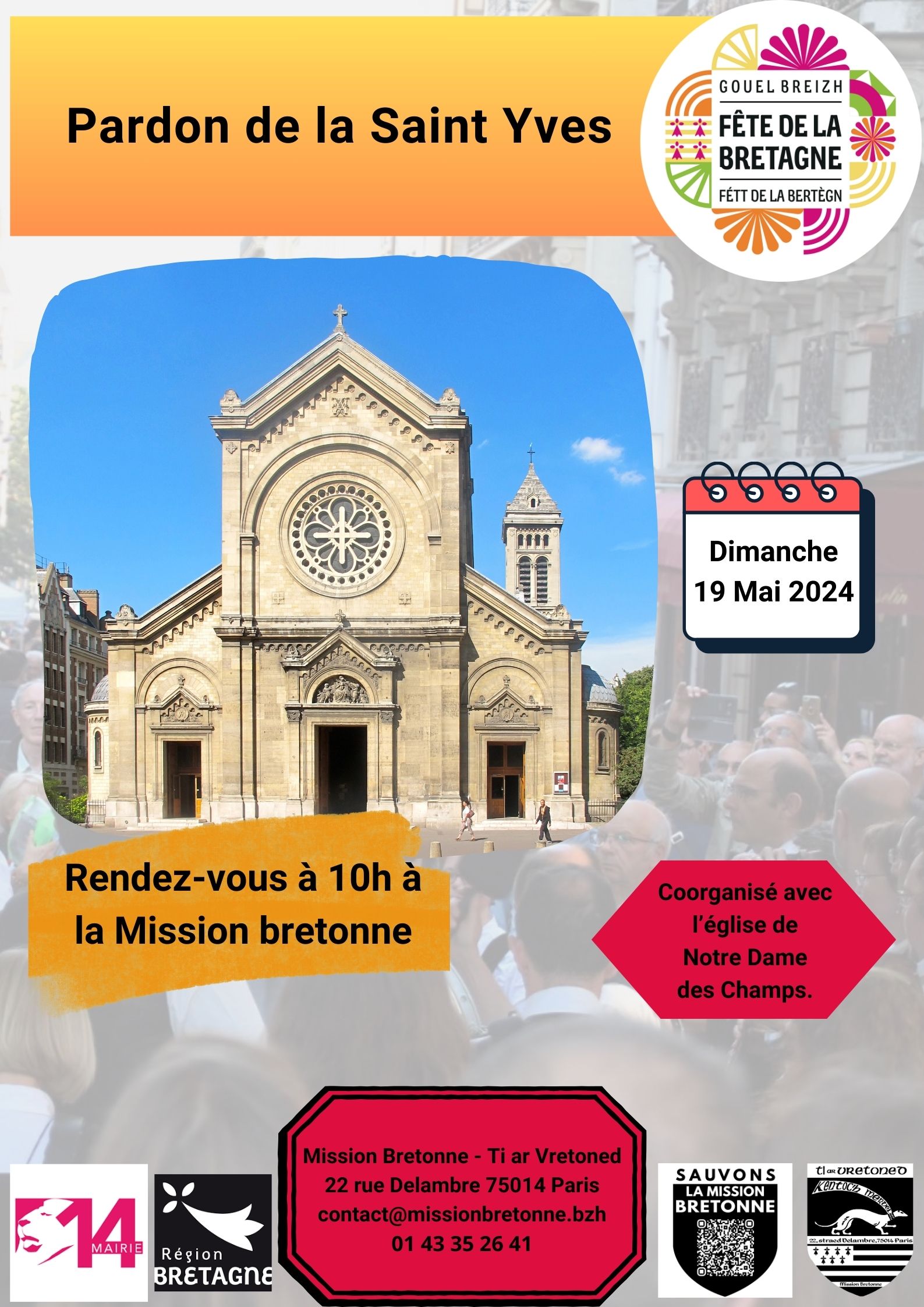 Le 19 mai a lieu chaque année le grand pardon de Tréguier et depuis les temps déjà lointains où les Bretons sont venus à Paris, ils ont toujours fêté Saint-Yves, d’abord à la Paroisse Bretonne de Paris située à Notre-Dame des Champs, puis, à partir de 1951 avec la Mission bretonne qui investissait les Arènes de Lutèce…