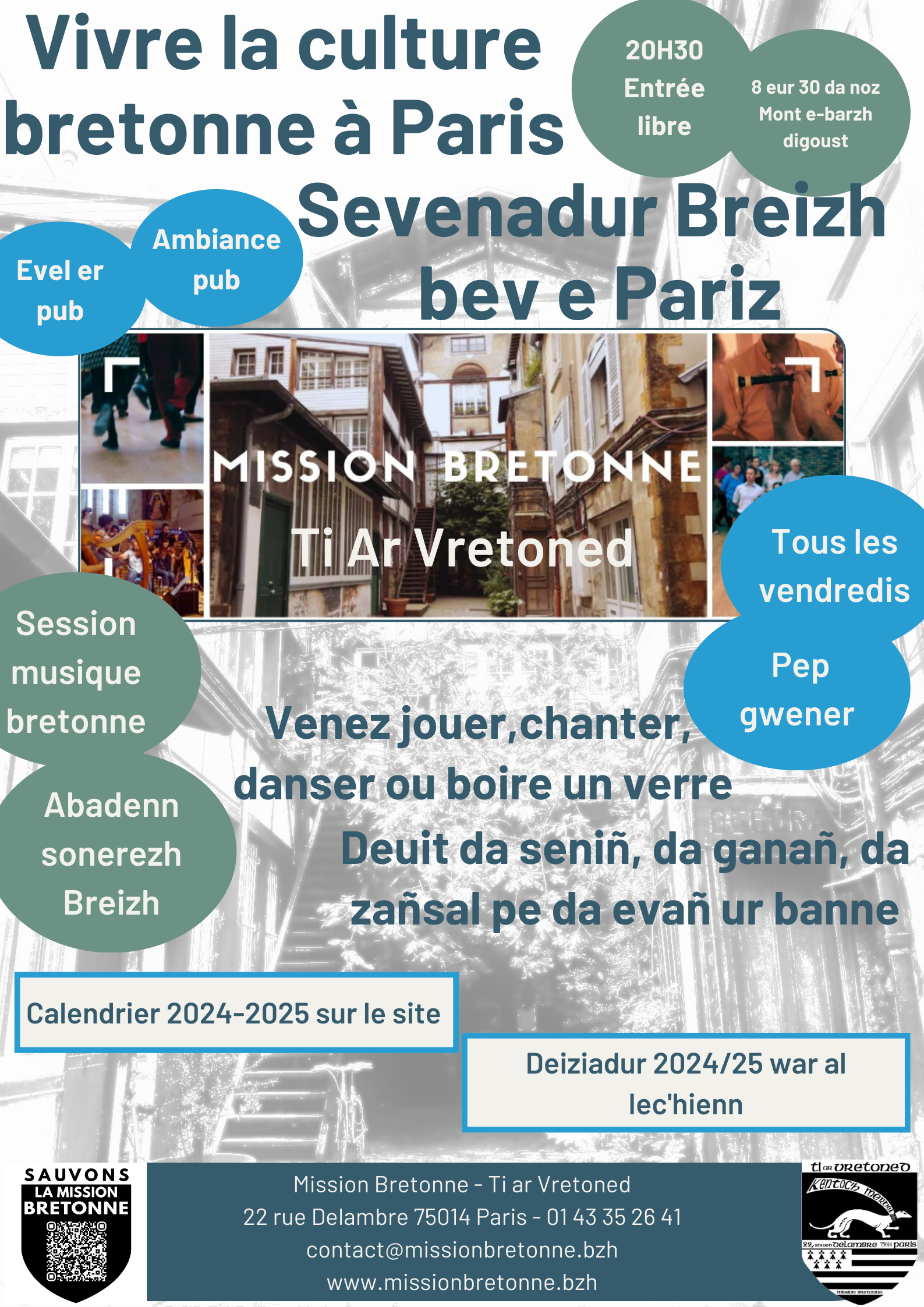 Kit davedomp da lid sevenadur hor bro ar bloaz-mañ adarre !Peb gwener da 8 eur 30 goude merenn e c’helloc’h adkavout spered Breizh e kreiz kêr-Bariz.