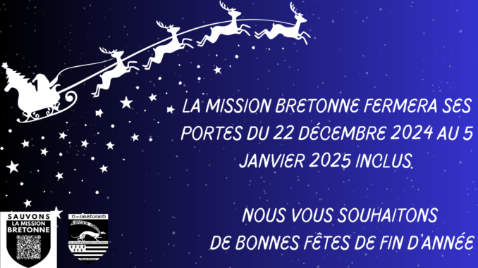 La Mission Bretonne fermera ses portes du 22 décembre 2024 au 5 janvier 2025 inclus pour les vacances de Noël. Durant cette période, nos activités régulières seront suspendues et les locaux ne seront pas accessibles.