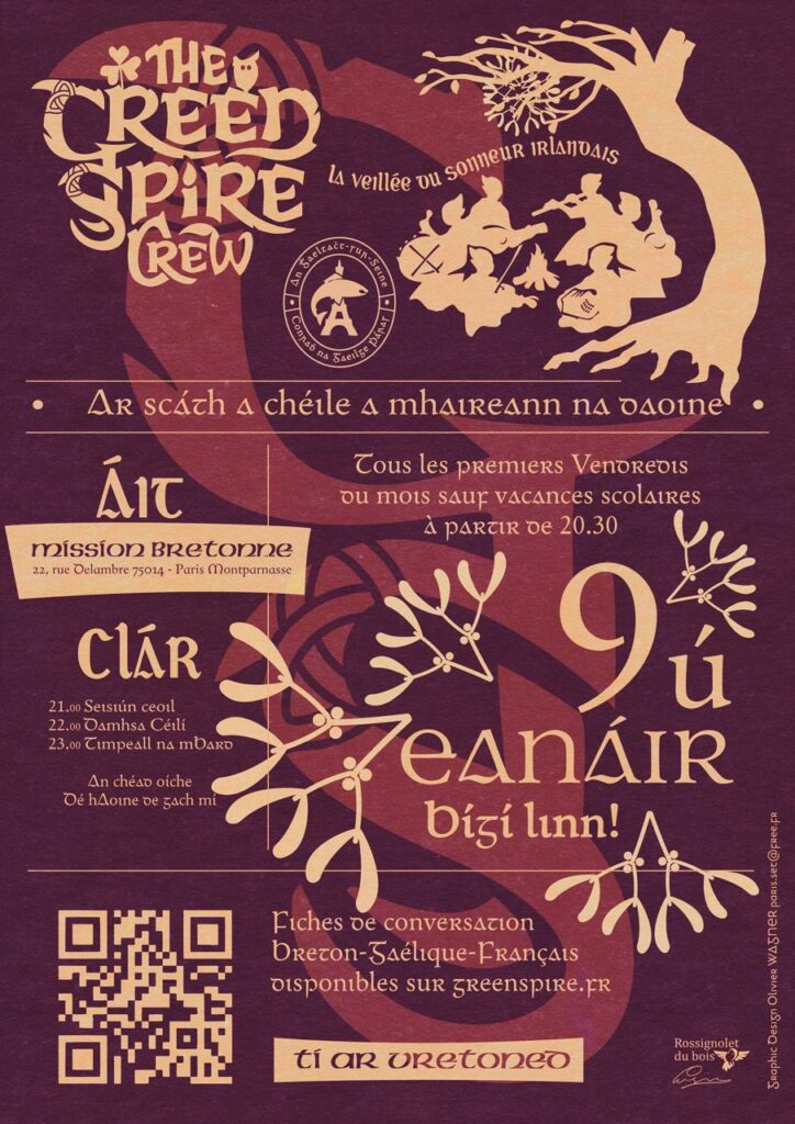 Veillée du sonneur irlandais, animée par The Green Spire et Conradh na Gaeilge Pháras – An Ghaeltach-sur-Seine, la ligue gaélique à Paris, en collaboration avec la Mission Bretonne Ti ar Vretoned
