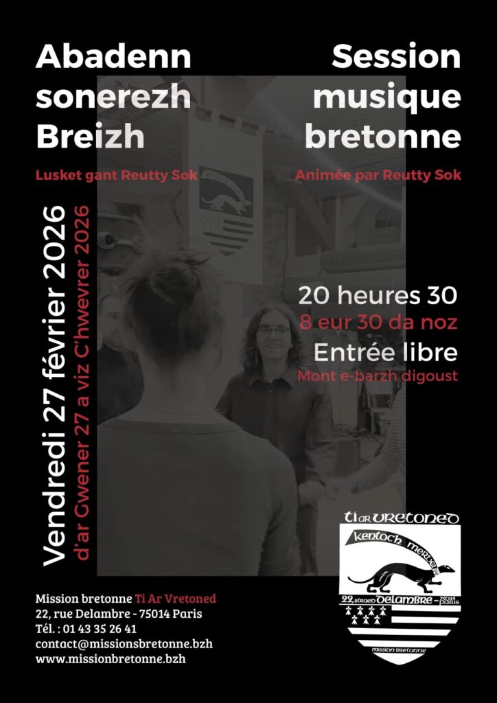 Session bretonne vendredi 27 février 2026 Enora Evénements 0 Rendez-vous pour de la musique, de la danse et de la convivialité, à partir de 20h30.