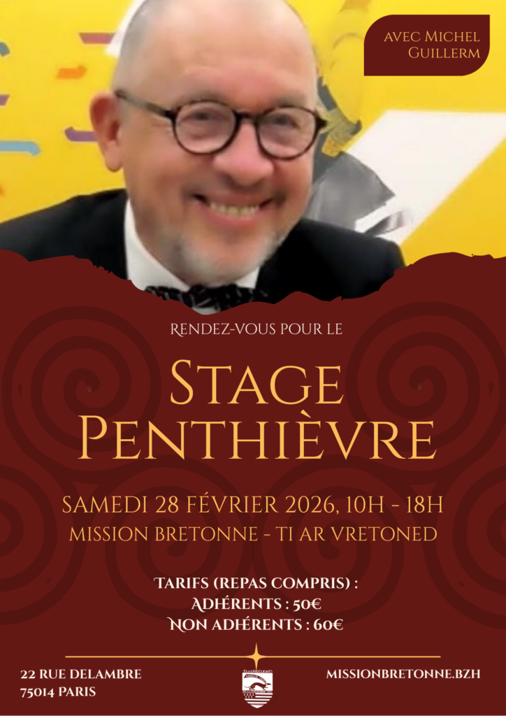 Stage Penthièvre samedi 28 février 2026 Sterenn LE COR Evénements 0 Samedi 28 février de 10h à 18h. Repas compris. Animateur : Michel Guillerm