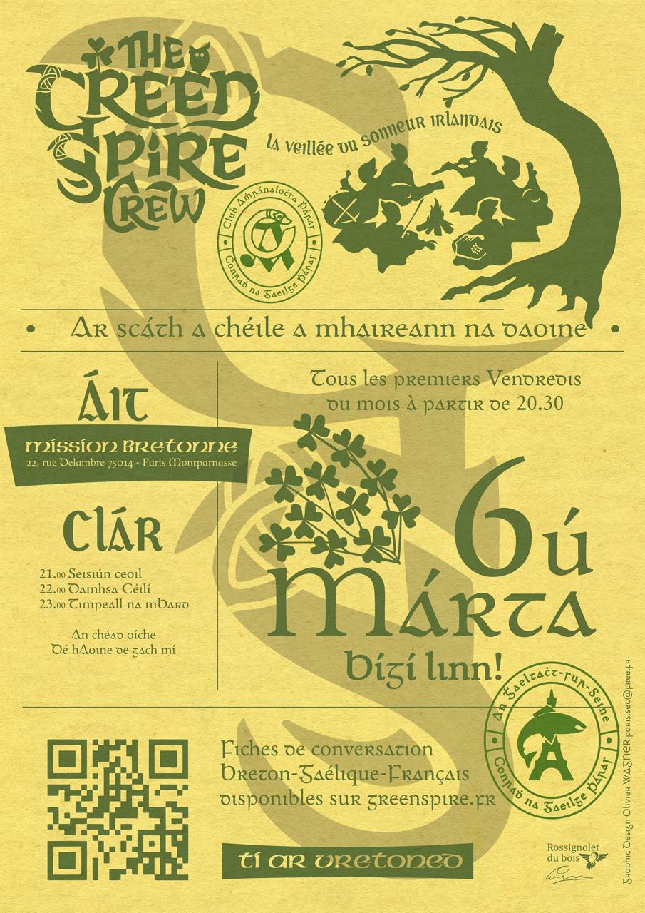 Veillée du sonneur irlandais, animée par The Green Spire et Conradh na Gaeilge Pháras – An Ghaeltach-sur-Seine, la ligue gaélique à Paris, en collaboration avec la Mission Bretonne Ti ar Vretoned