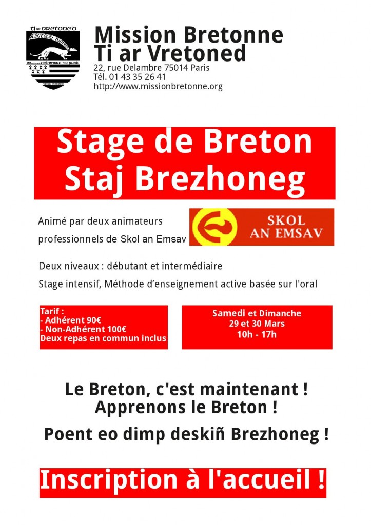 C’est pourquoi la Mission Bretonne organise un stage intensif de breton parlé dans ses locaux le week-end du 29 et 30 mars 2014.