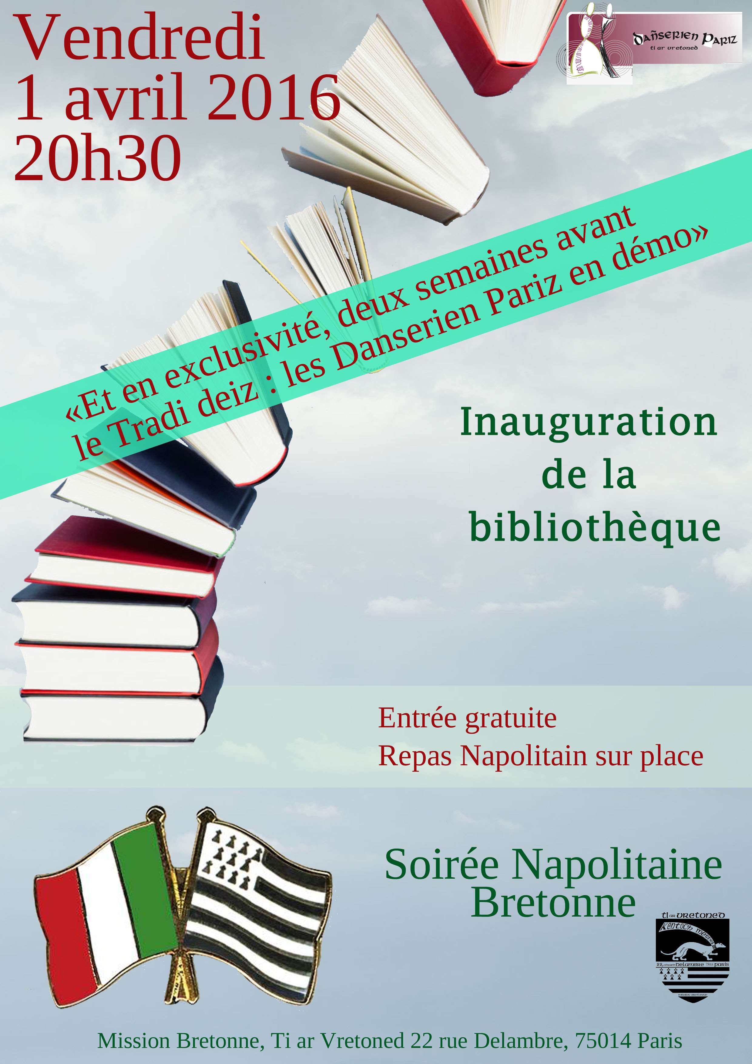 Soirée napolitaine vendredi 1 avril 2016 Mission Bretonne Evénements 0 Pour l’inauguration de la bibliothèque de la Mission, l’équipe cuisine vous propose une restauration napolitaine. Et en prime, une présentation par Dañserien Pariz des danses au concours Trad du 17 avril à Vannes.