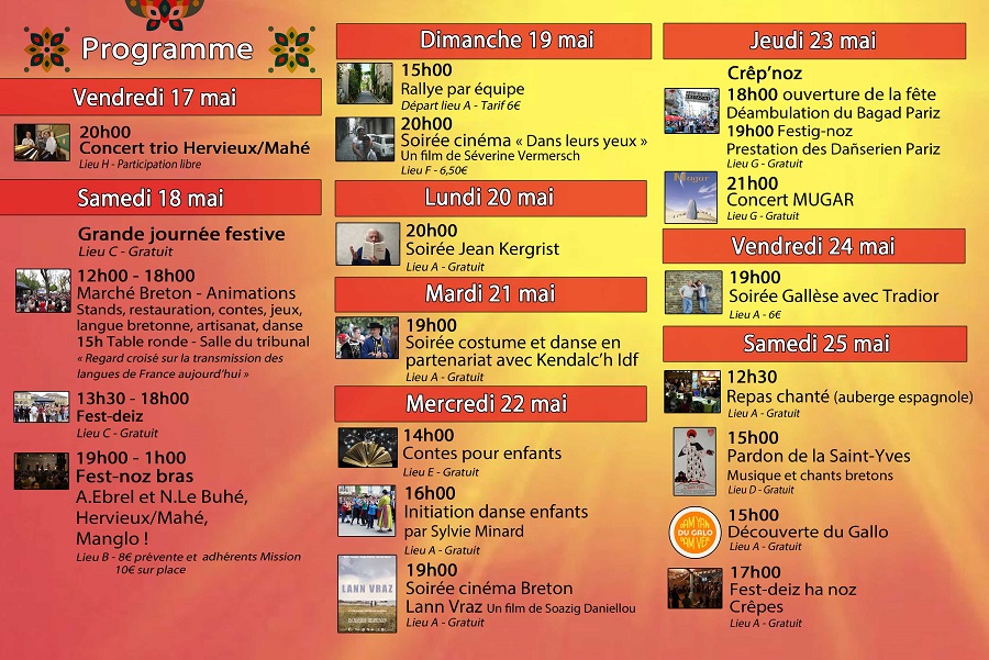Toutes les facettes de la culture bretonne : Fest-deiz, concours de sonneurs, initiation à la langue et à la danse bretonne, contes, jeux bretons. Marché breton : stands associatifs, commerciaux, artisanaux, culturels. Table ronde sur le thème de la transmission des langues de France aujourdhui.